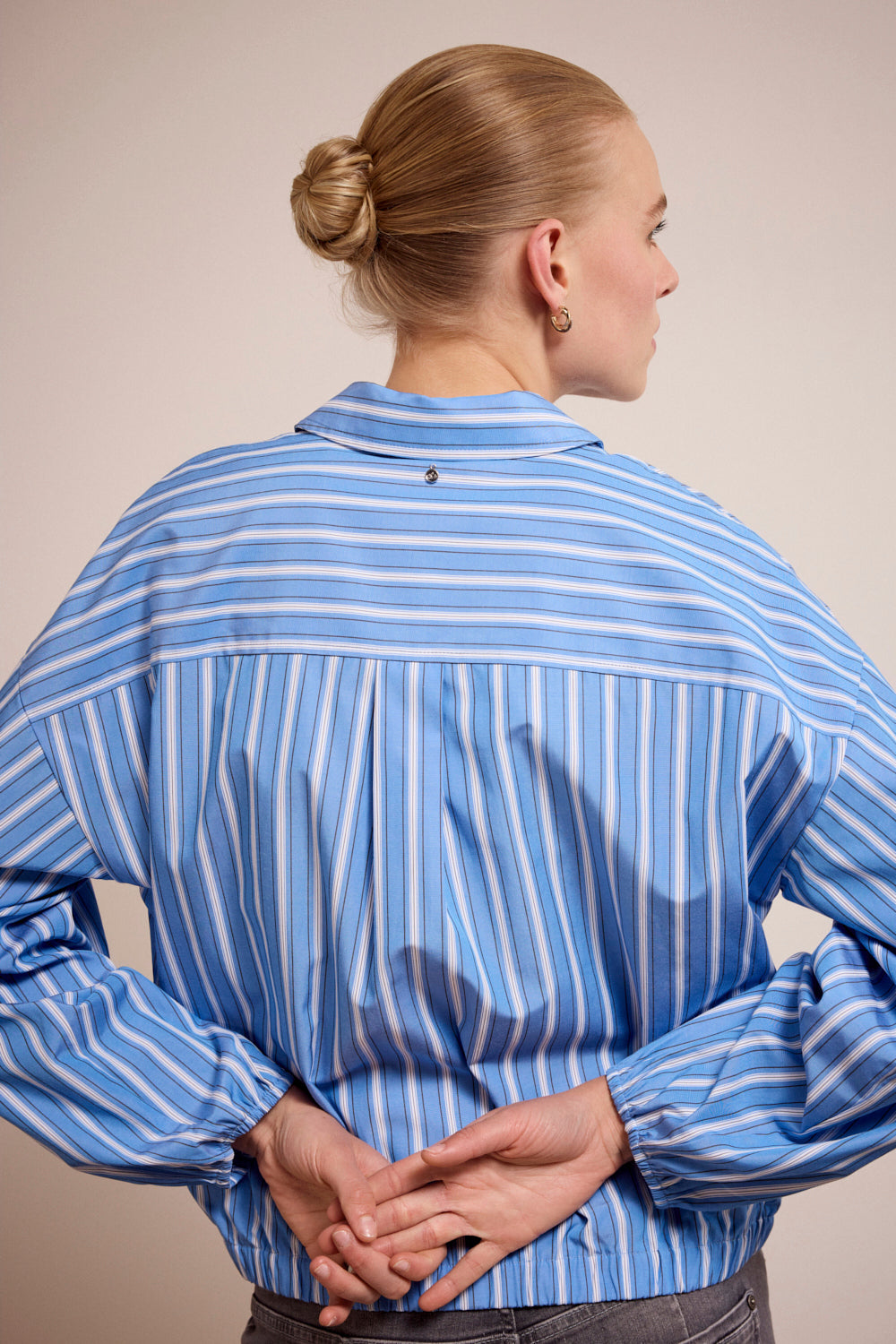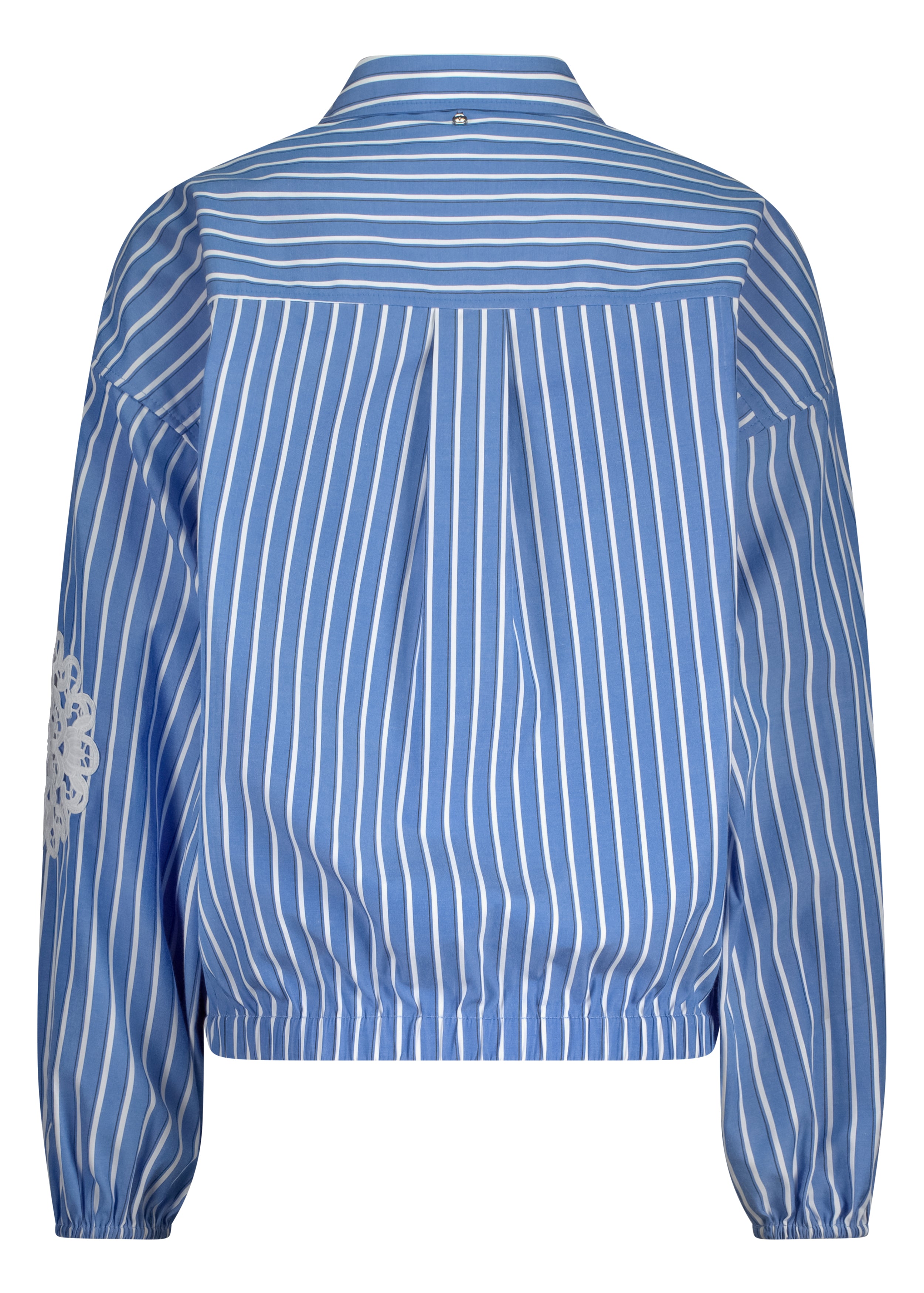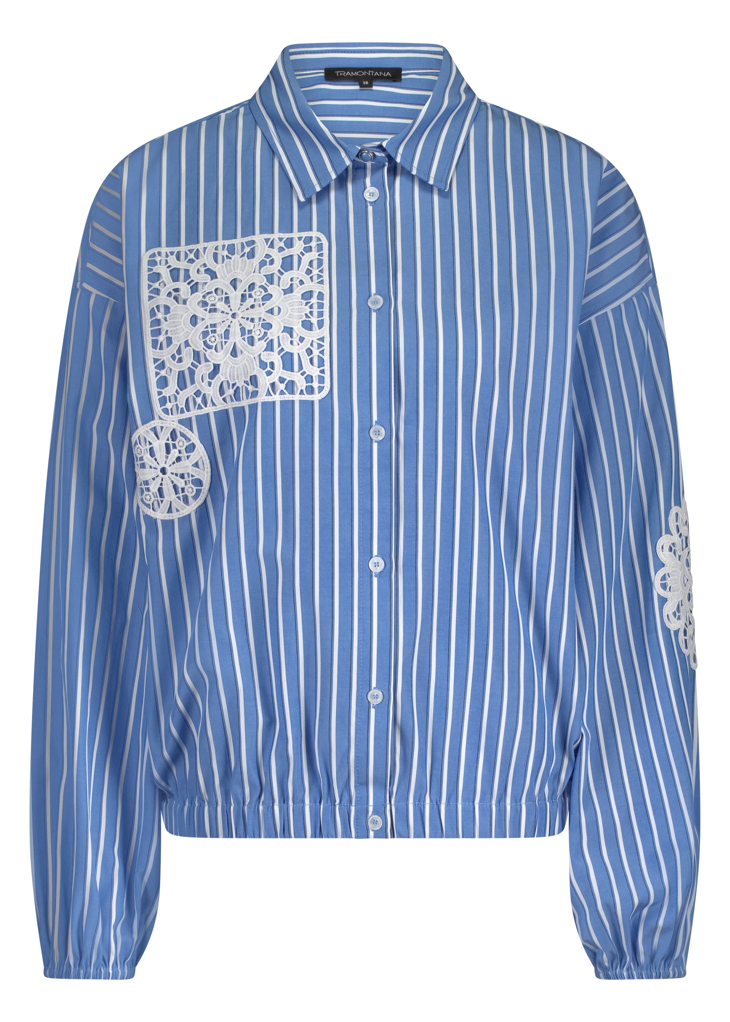 A refined blue striped blouse featuring crisp white stripes and delicate lace-inspired patchwork detailing at the chest. Designed with a clean, feminine silhouette, this Tramontana blouse adds subtle texture and elegance to everyday styling.